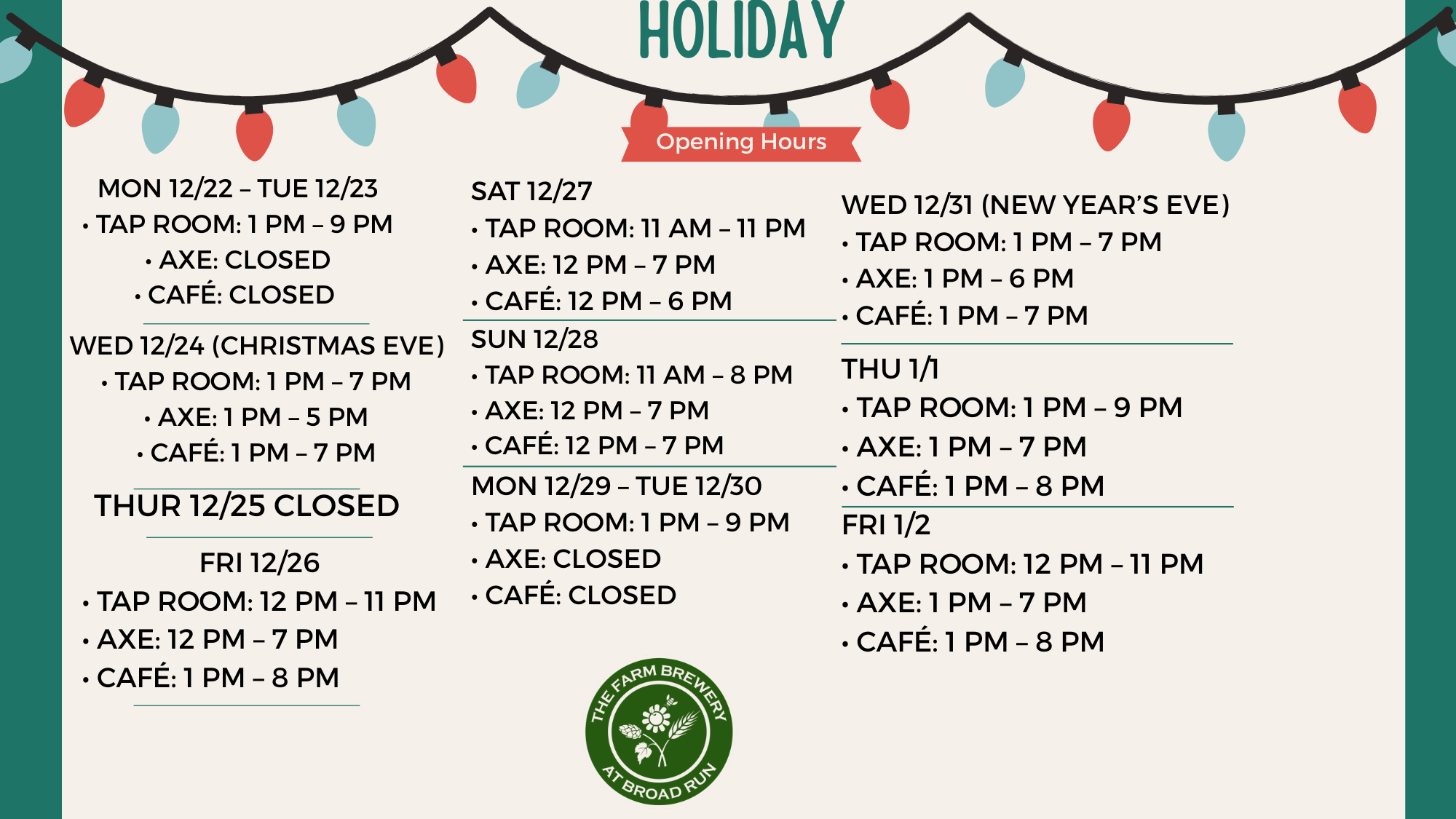 Are Dogs allowed at the brewery? –Yes, Dogs must be on a leash at all times! Can I bring a cake or cupcakes? –Absolutely, we love both! Are you family friendly? –We are, we even have a playground for kids. Who do I contact about renting a space? –Events@thefarmbreweryatbroadrun.com Can I bring my own food? – No, we do not allow any outside food and coolers are prohibited. Why do I see a $50 charge on my card when I start a tab? – The $50 charge is a hold for the tab, it will be refunded after your check closes. How old you do you have to be to throw axes? –You must be at least 16 years old. Where do bands play? –Bands can play one of three places, our main stage, our starlight stage and in the brew barn. Check out social media to see who and where the bands are playing! Where do I book axe throwing? Right here on this site! Just click the axe throwing tab.
